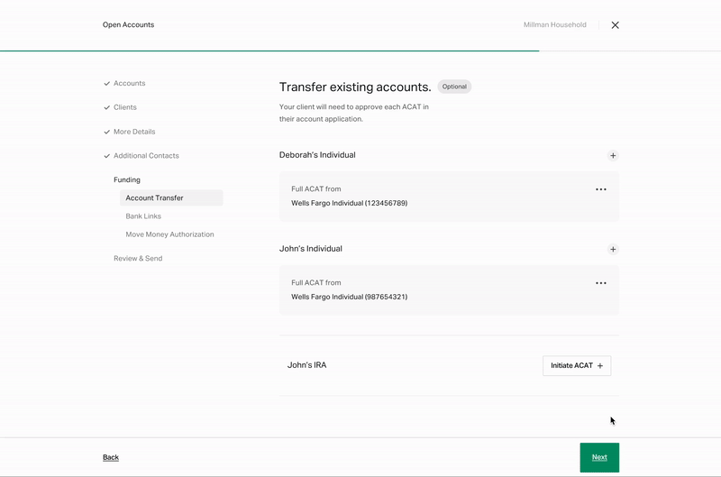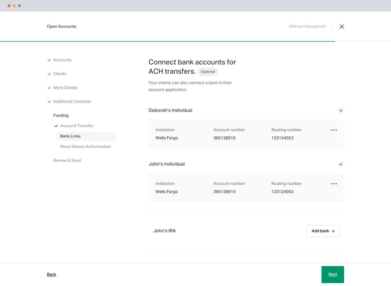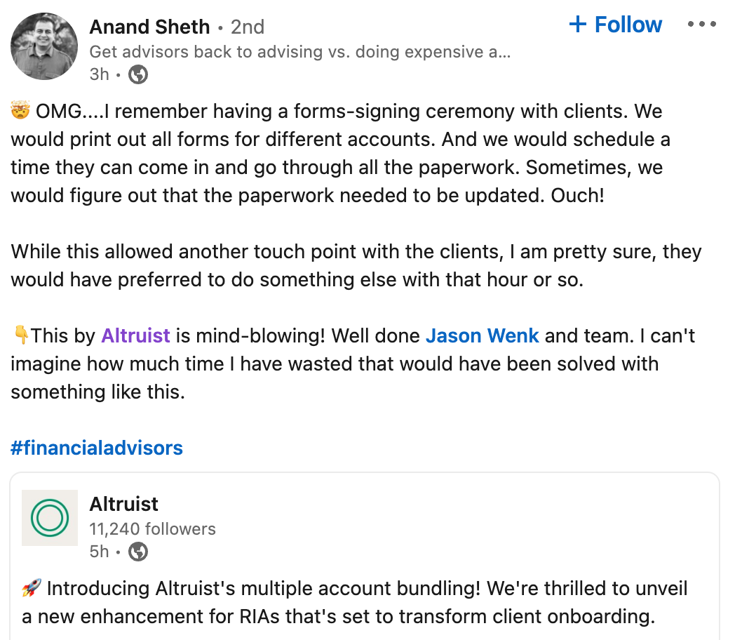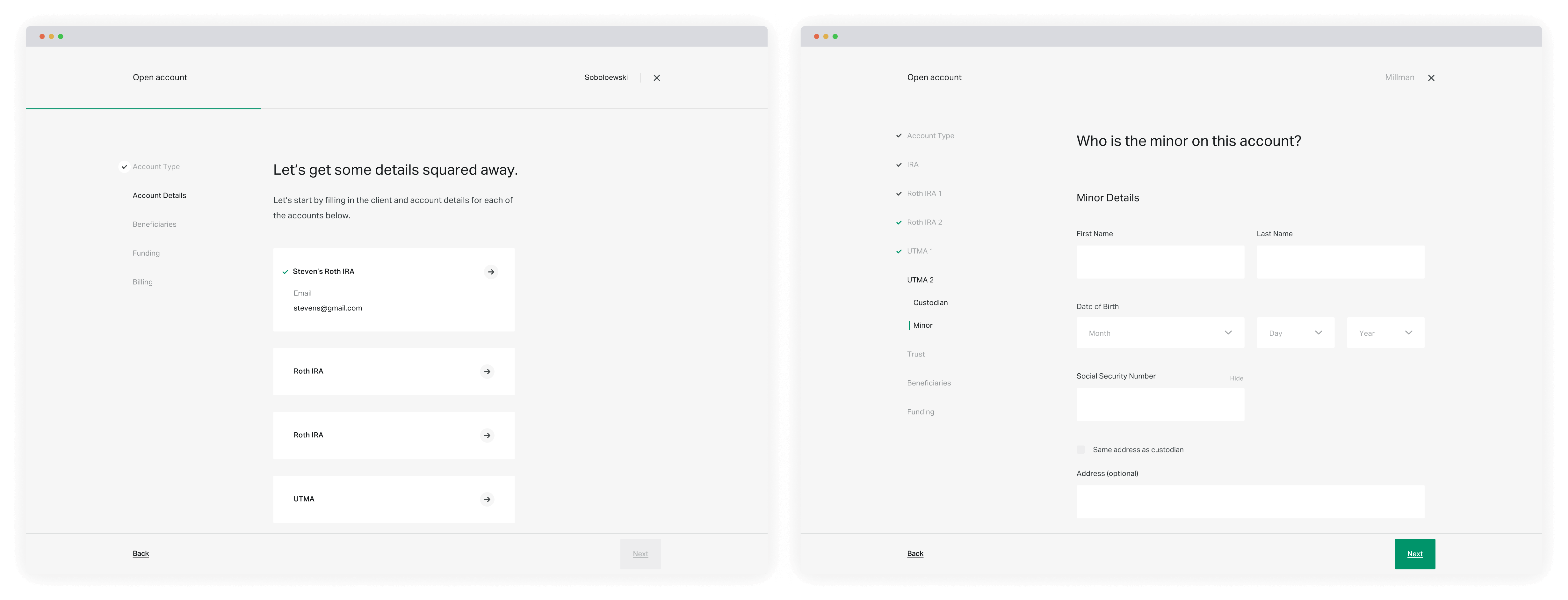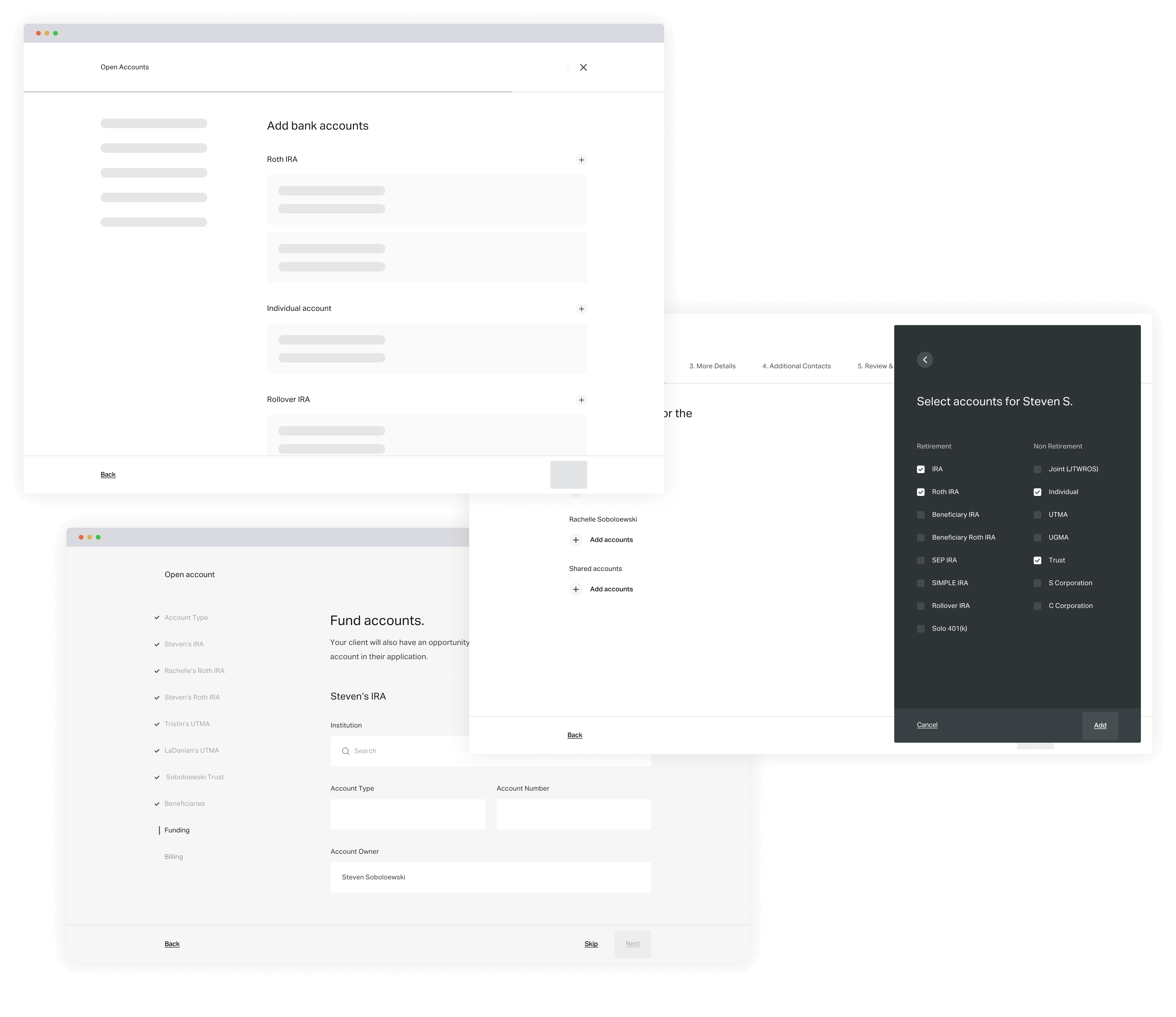 Advisors need to go through many steps to onboard a new client. They need to open multiple investment accounts, link bank accounts, transfer funds, and collect signed authorizations. With its redundant steps, contingent tasks, and lack of visibility, the onboarding process on Altruist had become painfully slow. It started to strain the advisor-client relationship and slow down a core piece of Altruist's revenue model.