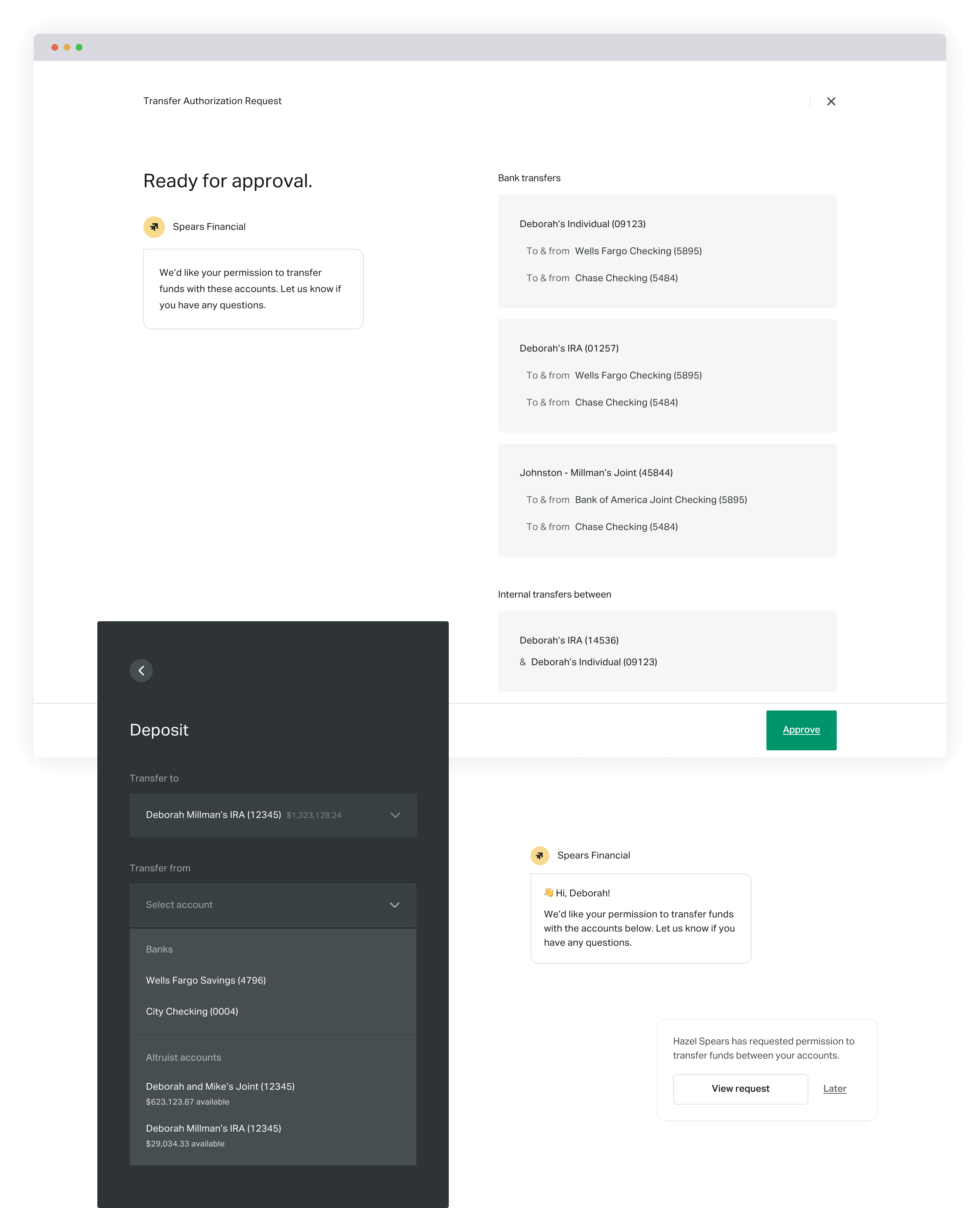 Altruist is an all-in-one platform for financial advisors to manage their business and clients. A core piece of an advisor's business is managing all transfers in and out of their client's accounts. Before this project, advisors were required get their client's permission for each and every transfer, or ask their client to initiate a transfer.